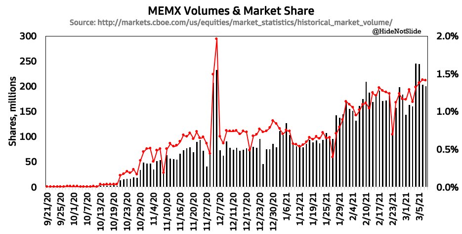 MEMX market share continues to inch upward in 2021, and volumes are near all-time highs at ~200 million shares per day. Just keep swimming, just keep swimming...pic.twitter.com/MQMK0ysIjI