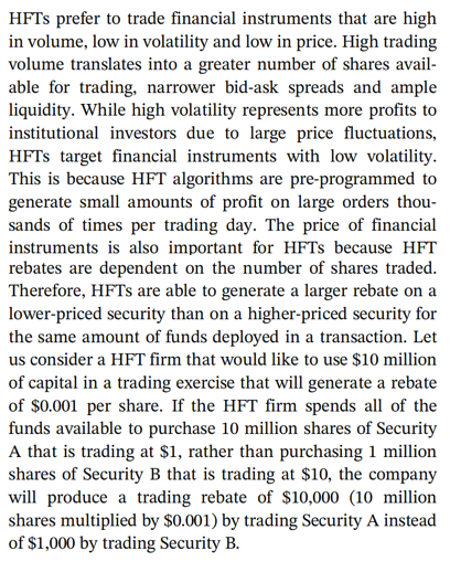 An HFT firm's dream market: High volume - low cost of trading & plenty of active participants to trade against Low volatility - low risk of surprise losses Low price - can exploit exchange rebate structurepic.twitter.com/PHm50Ckhle