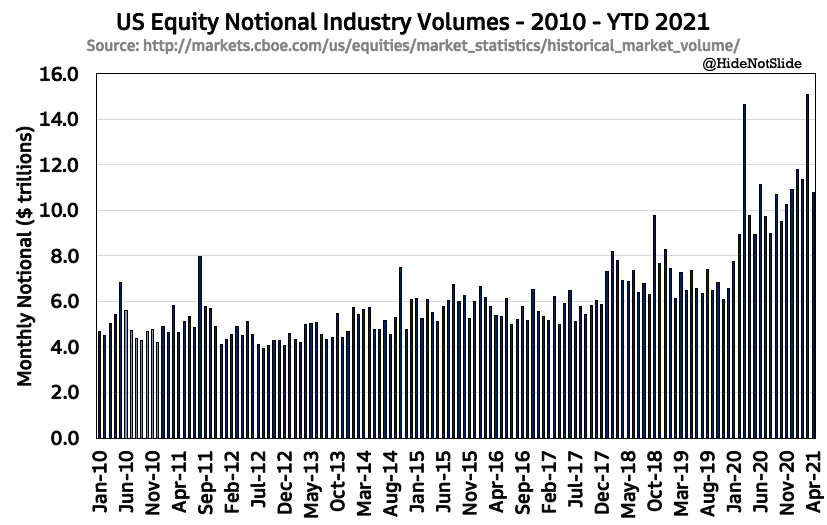 Volatility is down! VIX below 20! Retail bros have left the market! Trading volumes must have come back down to historical averages!