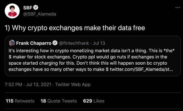 I found both these threads interesting & want to chime in w/my thoughts re crypto market data. To be clear, crypto exchanges will 100% charge for data at some point in the future no matter what @SBF_Alameda says. Here's why:pic.twitter.com/DBLsLPcjiU