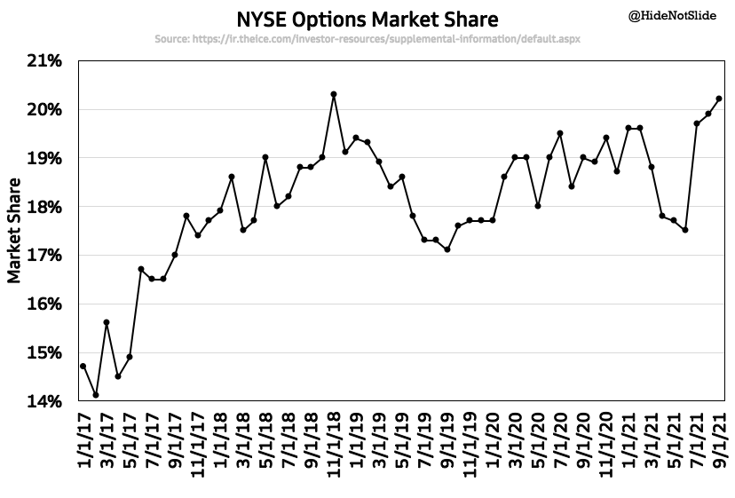 NYSE's options market share is nearing decade highs, past 20% for the first time since late 2018. Aggressive pricing has played a big part - NYSE's revenue capture has dropped from $0.13 per contract in 2017 to $0.05 today.pic.twitter.com/8DmQ1JgHGg