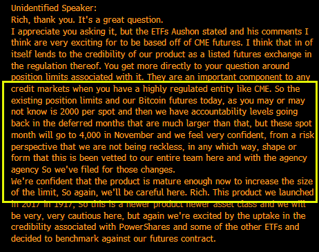 The CME earnings call was unsurprisingly dominated by ETF qs. Here they are saying they aren't being reckless raising position limits and feel futures mkt has matured and they excited about ETF participation. Good clue that they likely to be lax re $BITO acct levelspic.twitter.com/zRCfgEybU6