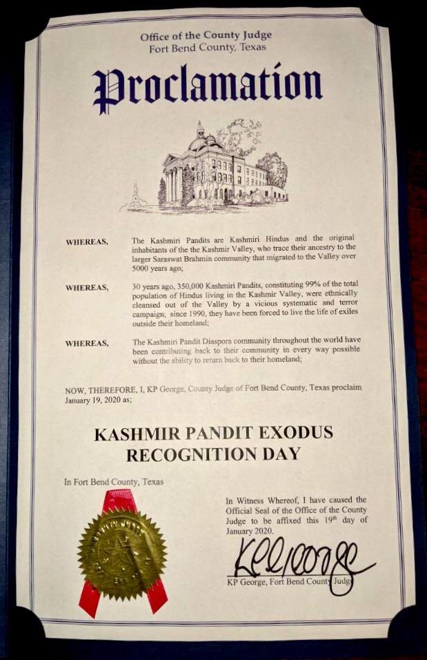 Fort Bend County, Texas proclaims 19th January 2020 as “Kashmiri Pandit Exodus Recognition Day”. Congressman