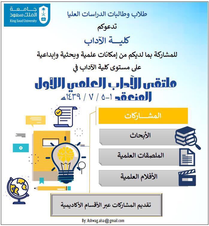 دعوة لطلاب وطالبات الدراسات العليا للمشاركة في ملتقى الآداب العلمي الأول. (التفاصيل في الإعلان المرفق)pic.twitter.com/PI7jlYEfEa