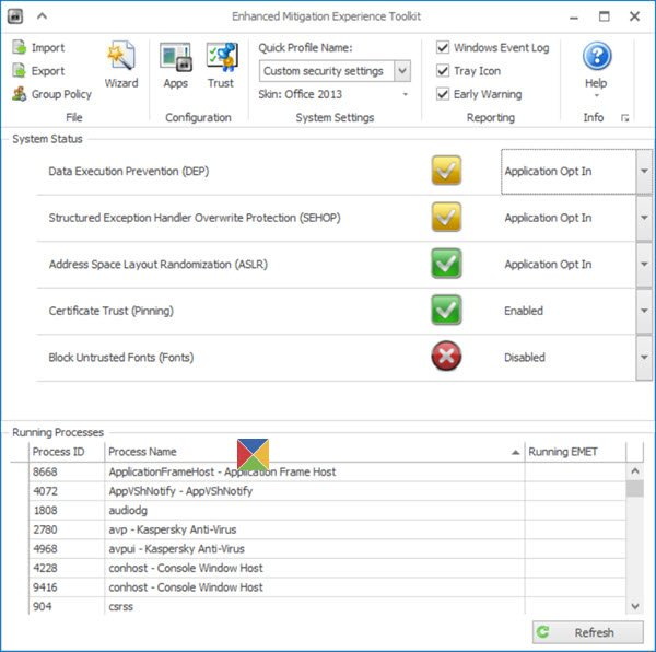 Since this tweet, I've been playing around with this idea in my free time and I'm almost done with a first draft. Microsoft used to have EMET, a GUI tool that would allow administrators and users to configure the exploit mitigations built into Windows. https://twitter.com/HockeyInJune/status/1071506842600263680 …pic.twitter.com/K5nA8Ck3Sc