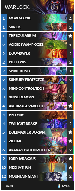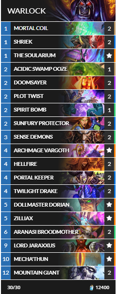 #RiseOfShadows Plot Twist Warlock Dunno about Portal Keeper seems nice on paper but reduces the heal. Mecha'thun Combo vs control decks 1. Dorian 2. Plottwist 3. Shuffle in Mecha'thun + Bomb + Shriek 4. Bomb Mecha'thun 5. Shriek discard Mecha'thun clear board 6. Winpic.twitter.com/FPTnIfIRsx