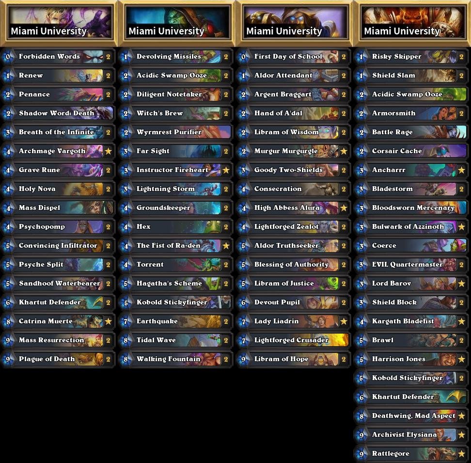 Varsity Hearthstone Team's deck line up for @ZipsEsports 's invitational this weekend. Big thanks to @hs_Pasca who helped us analyze the current tournament meta. Behold a brave meta call that is looking truly promising.pic.twitter.com/dw4cpOtWPO