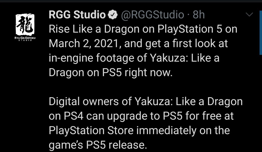 "To clarify, physical owners of Yakuza: Like a Dragon on PS4 can also use the original disc to upgrade to the PS5 version when it releases on March 2, 2021."