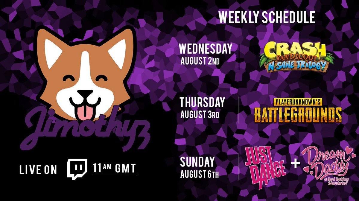 This weeks stream sched! Early hours for tomorrow and thurs BUT we're back on the regular sched on Sunday. Blame @namivanmar for Sunday.pic.twitter.com/LN4VhVJAvX