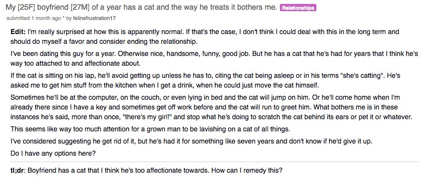 I mean, I don't know, but telling your boyfriend to kill his somewhat insecure cat of 7 years is possibly the worst thing I've read on Reddit in awhile. That dude made the right call and may God have mercy on her poor cat-hating soul.