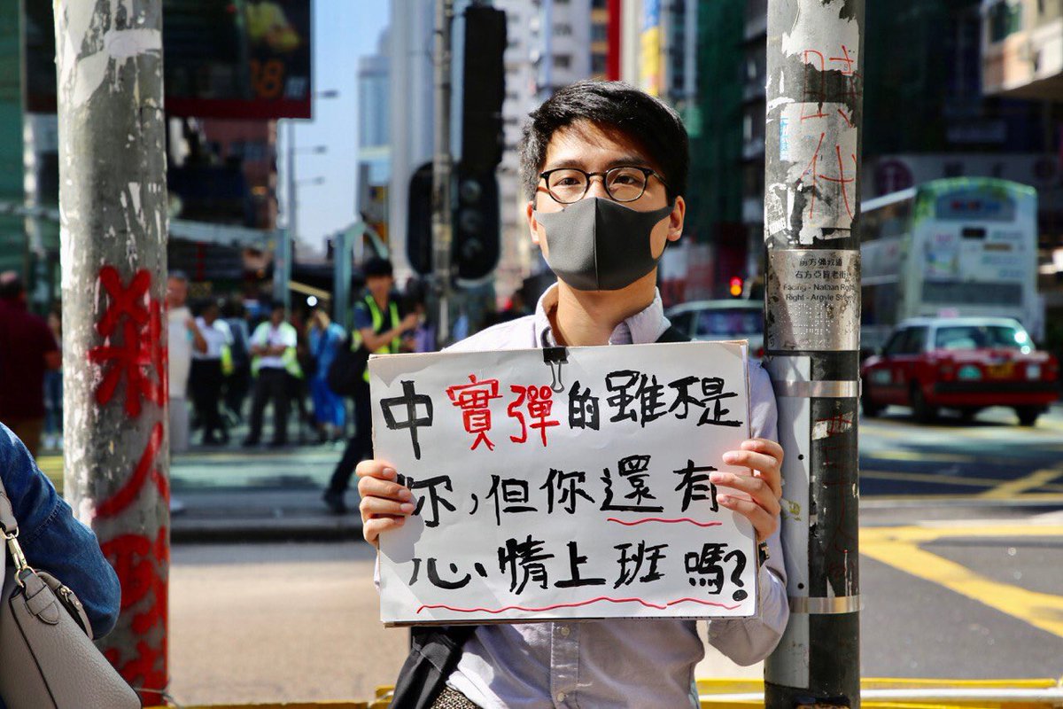 A university lecturer goes on strike in Mong Kok, holding up a sign reading: “it’s not you who was shot with a live round, but do you still have the mood to go to work?” Photo: InMedia. #hongkongpic.twitter.com/F6x6L2ALHL