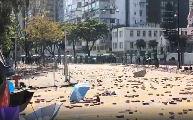 A stand-off continues, as riot police mass outside the Rosary Church on Chatham Road South, and protesters mass behind barricades with umbrellas on Austin Road. Photo: Stand News screenshot. #hongkongpic.twitter.com/7nK6enTxTD