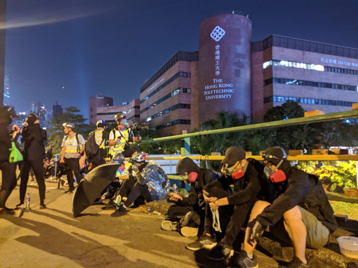 The situation has quietened down again after police attempted to push through the western gates of PolyU with armoured vehicles after midnight. Photo: Viola Kam / USP. #hongkongpic.twitter.com/MPz267lWh7