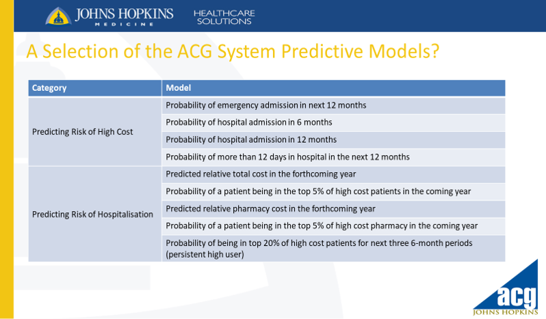 #ACGSystem contains multiple#PredictiveModels to allow users to choose the right model for the population or segment of interest. Two types of model exist – those related to future cost and those related to risk of hospital admission#PopulationHealthpic.twitter.com/B0u4LcK0zZ