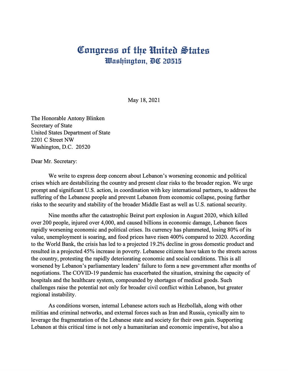 @RepTedDeutch and over 20 Members of Congress, called for continued U.S. engagement and support to the Lebanese people 3/3https://twitter.com/HouseForeign/status/1394796136691605506?s=20 …