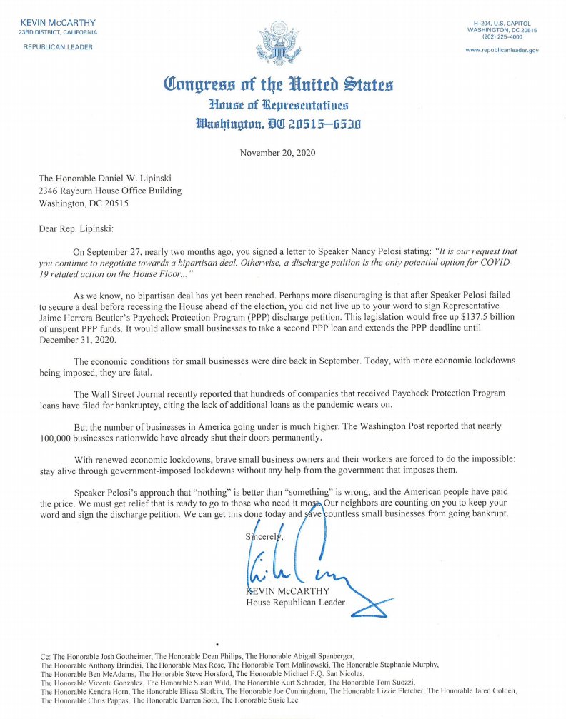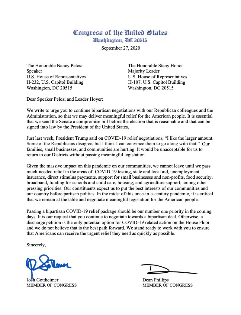 I just sent this letter to the 23 House Democrats who told Pelosi in September that they would move forward with COVID-19 relief with or without her. Now it's time for them to live up to their word.pic.twitter.com/fpu4RM8knZ