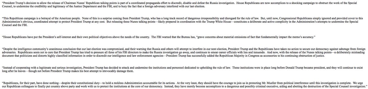 The Members said: "President #Trump’s decision to allow the release of Chairman #Nunes’ Republican talking points is part of a coordinated propaganda effort to discredit, disable and defeat the Russia investigation." Read their entire statement⬇️pic.twitter.com/AoXDS0Xq7v