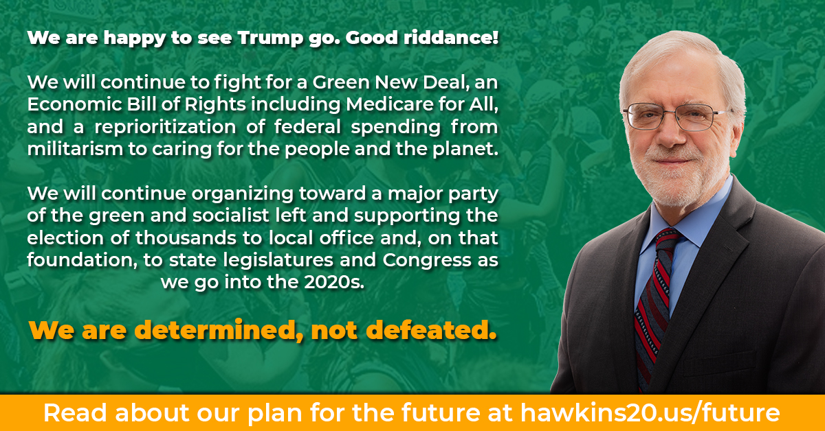 Just because the election is over doesn't mean our work to build the Green Socialist movement has come to an end. In fact, it's just beginning! Read about our plans to continue to build a united left, from the bottom up. Read our plan at https://hawkins20.us/future pic.twitter.com/tzaavOl6gO