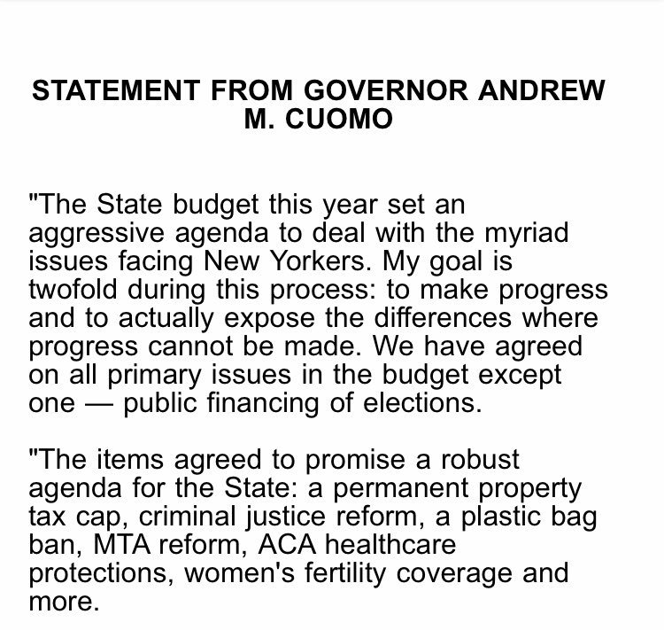 State budget update via @NYGovCuomo — a lot settled but campaign finance reform pic.twitter.com/AIeZSZxslF