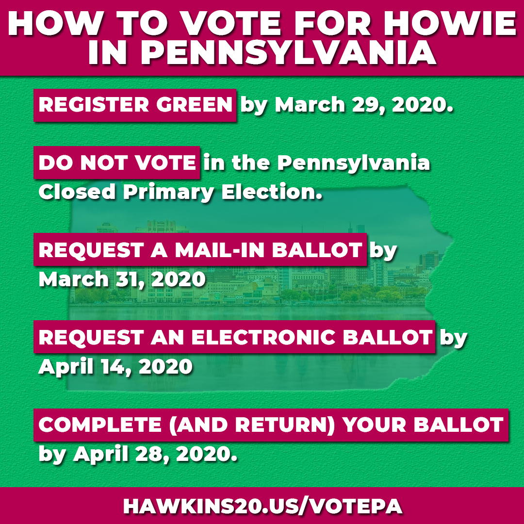 The Green Party of Pennsylvania has cancelled all in-person caucus meetings. Instead, they are asking registered Pennsylvania Greens to use the mail-in absentee ballot option or the electronic option. Find out what you need to do to vote below. https://howiehawkins.us/how-to-vote-for-howie-hawkins-in-pennsylvania/ …pic.twitter.com/ylBuGCP2r1