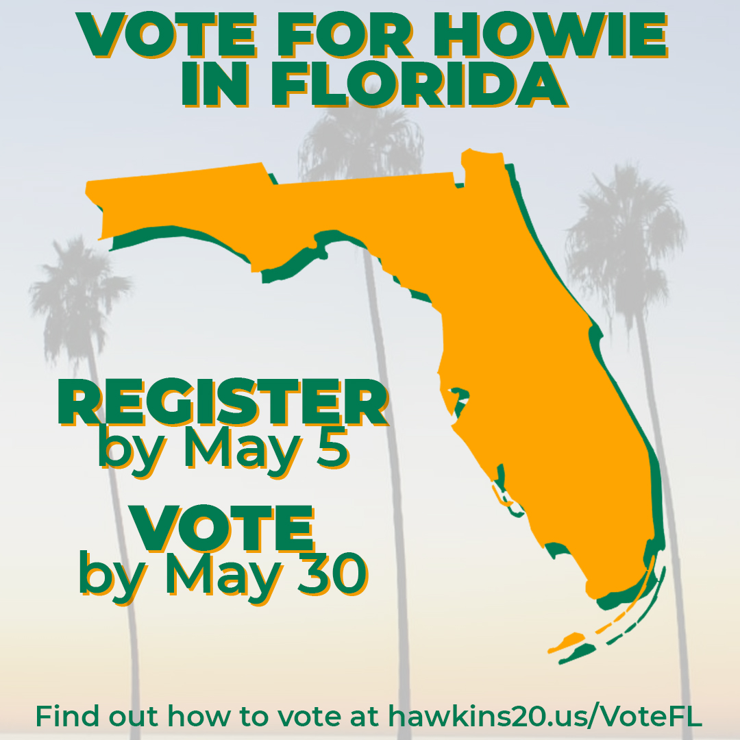 Today is the first day to vote for Howie in Florida! Voting will be open through May 30, but you only have until May 5 (Tuesday) to follow the instructions linked below to register Green. https://hawkins20.us/VoteFL pic.twitter.com/QXDpV865X4