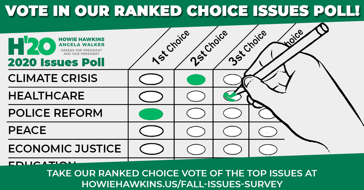 All of those topics are important. I love RCV. You and Angela have really been on point. #HowieHawkins and #AngelaWalker really "get it". #Green2020 #HawkinsWalker2020