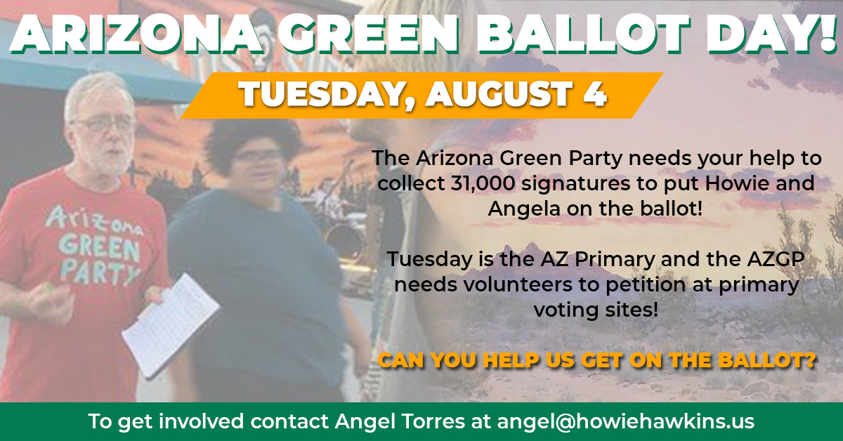 We have just over a month to collect 31,000 signatures in Arizona and THIS TUESDAY is a BIG OPPORTUNITY to collect! Tuesday is the AZ Primary and Greens will be hitting the polling places to collect signatures. Contact Angel Torres at angel@howiehawkins.us to get involved.pic.twitter.com/GATX6aUsTJ