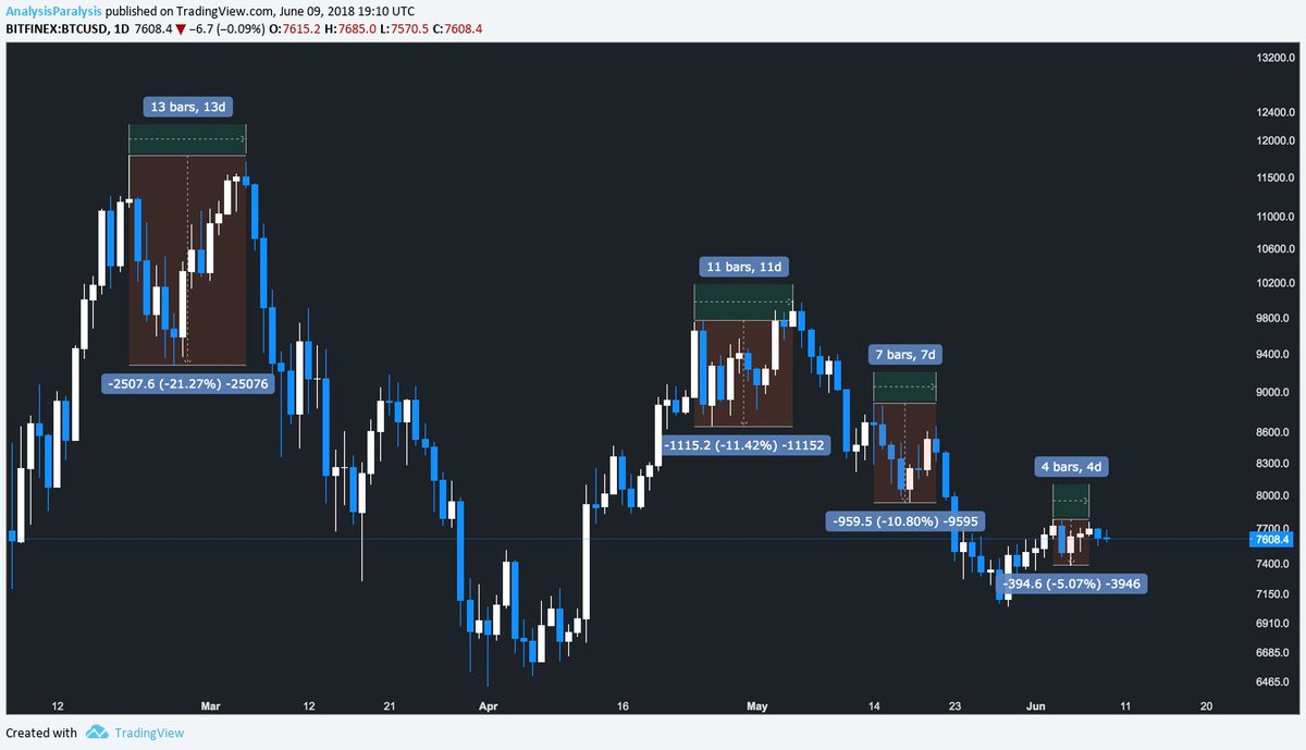 Each drop was about 45% apart from 10k-7k that was 30%. Respecting the trendline means only a 10% drop, a 30% drop inclines to 5.4k and a 45% drop could mean a retracement to 4.3k. The 30% and the 45% drops line up with support. There is even chance for 7k. Good Job! Neat chart