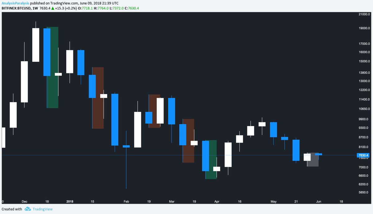 $BTC 1W Waiting on confirmation, but as of now it's printing an inside bar. All the previous ones were followed by relatively large bodied candles. So, whatever happens this coming week, we should at least see some volatility, and a larger range.pic.twitter.com/umdLYyc8S5