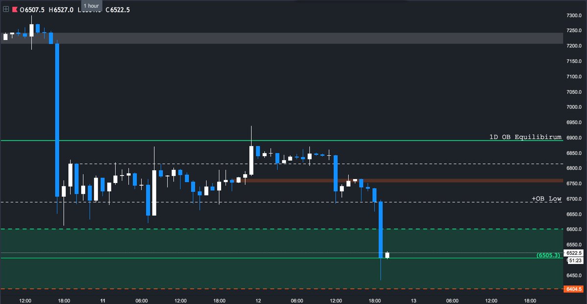 1h: Bearish breaker did it's job, and much more. Looking for a close above the demand zone midpoint (6505) for a bounce. Otherwise, I doubt 6400 holds.pic.twitter.com/7moZYWYh37