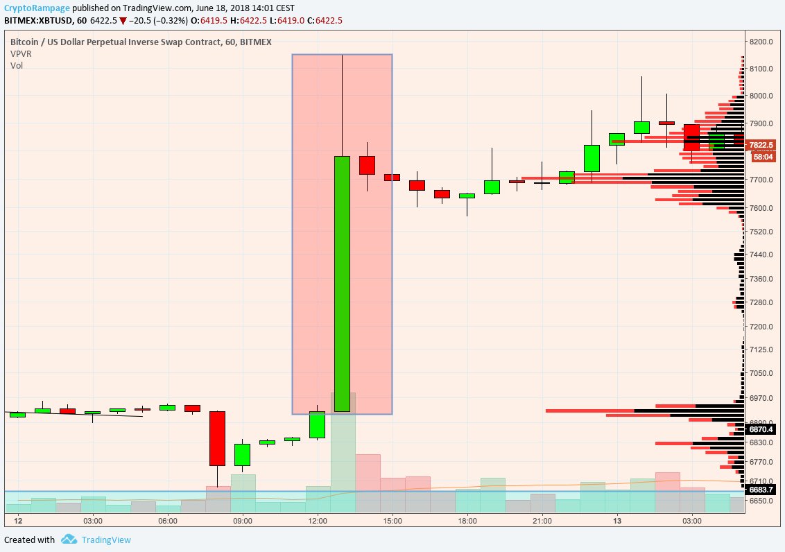 S H O R T S W E R E A T A N A T H. C A S C A D I N G L I Q U I D A T I O N S. (I agree about bottom shorters possibly getting rekt, but just because we had a $1k candle once around similar levels/patterns/etc., it doesn't mean it'll happen every-time they reappear.)https://twitter.com/Thrillmex/status/1008682057952710657 …