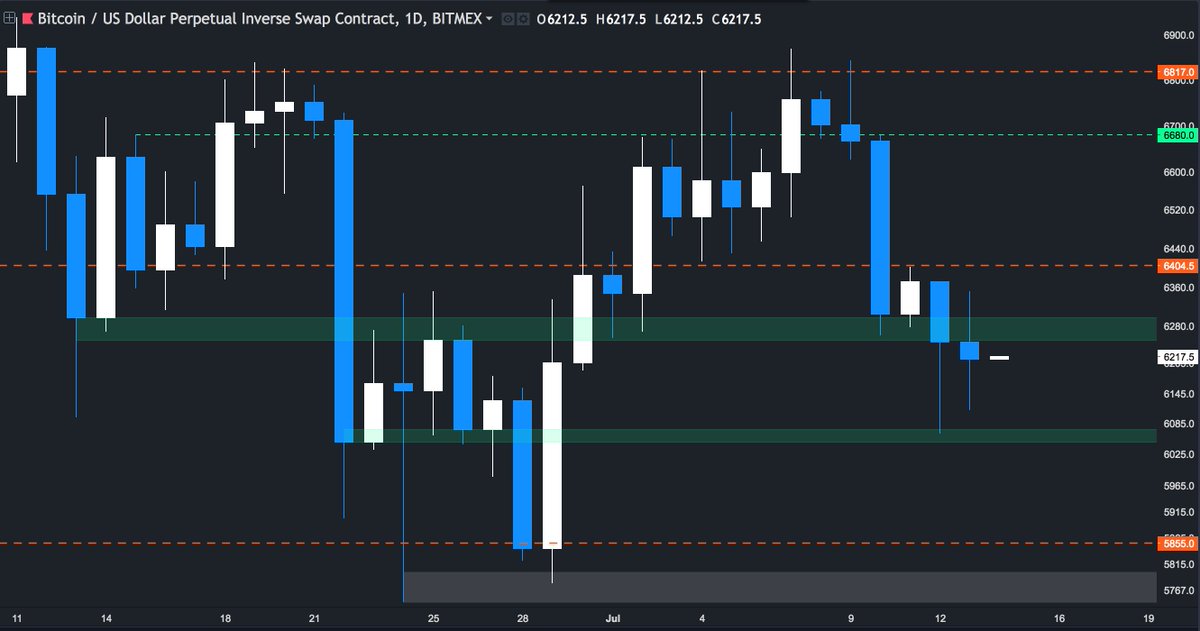 $BTC 1D (08/13/18) Range-bound • 5th consecutive day consolidating between 6530 and 6065. Small bodies, long wicks on both sides, • Longer the consolidation, larger the expansion. • Downside break (leaning towards): Retest of yearly lows • Upside break: Retest of zone markedpic.twitter.com/hmUcrop9W7