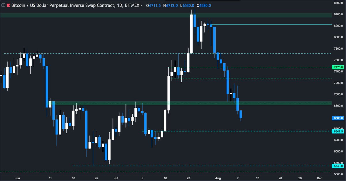 $BTC 1D (08/08/18) • 6350 support broken. • Found support on the second test of a daily level • This mechanical selloff has left plenty of voids on the way down which should fill on a DCB. • Until 6900 is broken with volume, I think yearly lows are very much in play.pic.twitter.com/VGIz5JRDnB