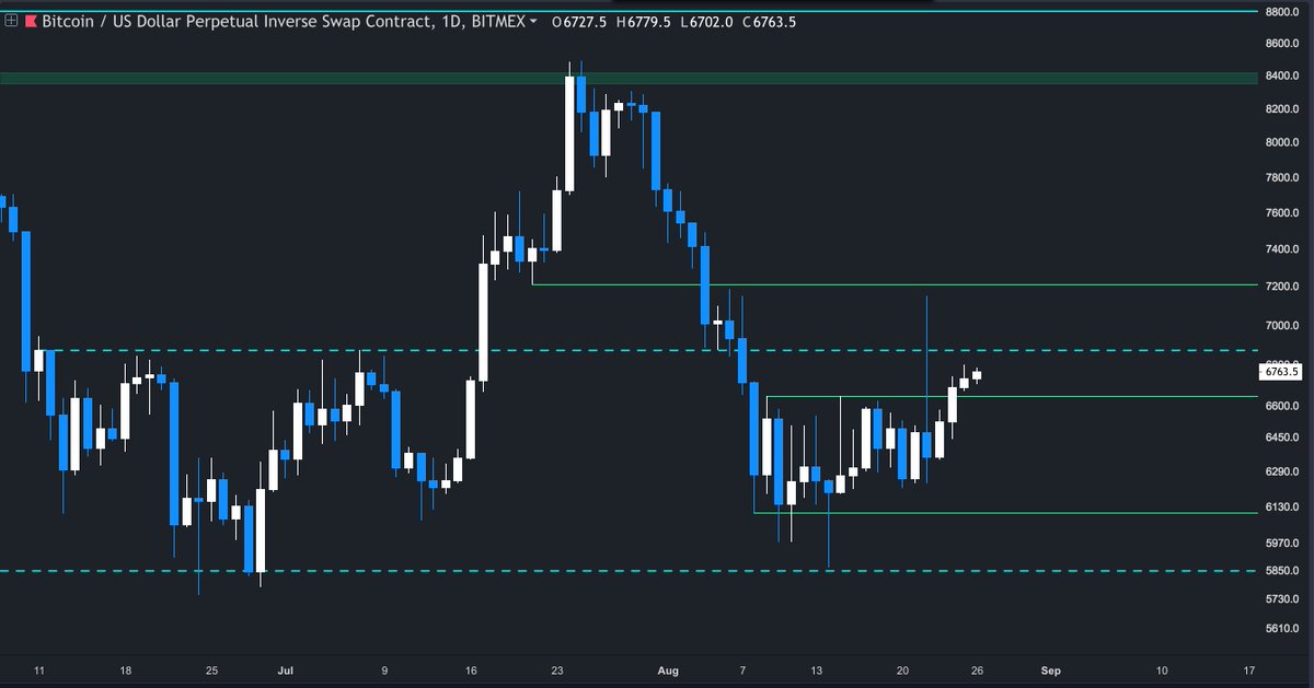 $BTC 1D (08/25/18) • Inching up after the range breakout • Long upper wicked candle, but not too concerned given it's the weekend. • Small bodied candles precede large bodied ones. • Resistance: ~6870 (1W level) • Support: 6640 (Range high) • Bias: Bullish.pic.twitter.com/v1S30MHpR4