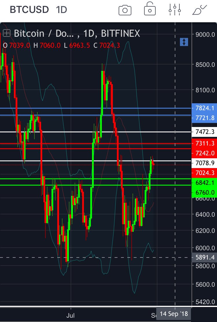 $BTC 1D (08/29/18) • Bounced perfectly off the 6870 support. • 7180 is a pivotal resistance, supply zone high + mid point of last move down. • Once this breaks cleanly, targeting 7800. • Think we'll chop around some more, forming another range on the LTFs. • Bias: Bullishpic.twitter.com/VZFzy2BbDE
