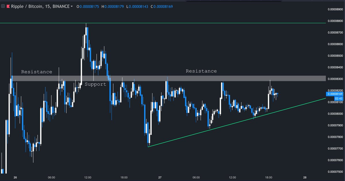 $XRP - Forming an ascending triangle (higher lows, equal highs) on the lower time frames. - Targeting the prev local high on a break of the pivot (flips b/w support and resistance) zone.pic.twitter.com/BwmuOeEYoF