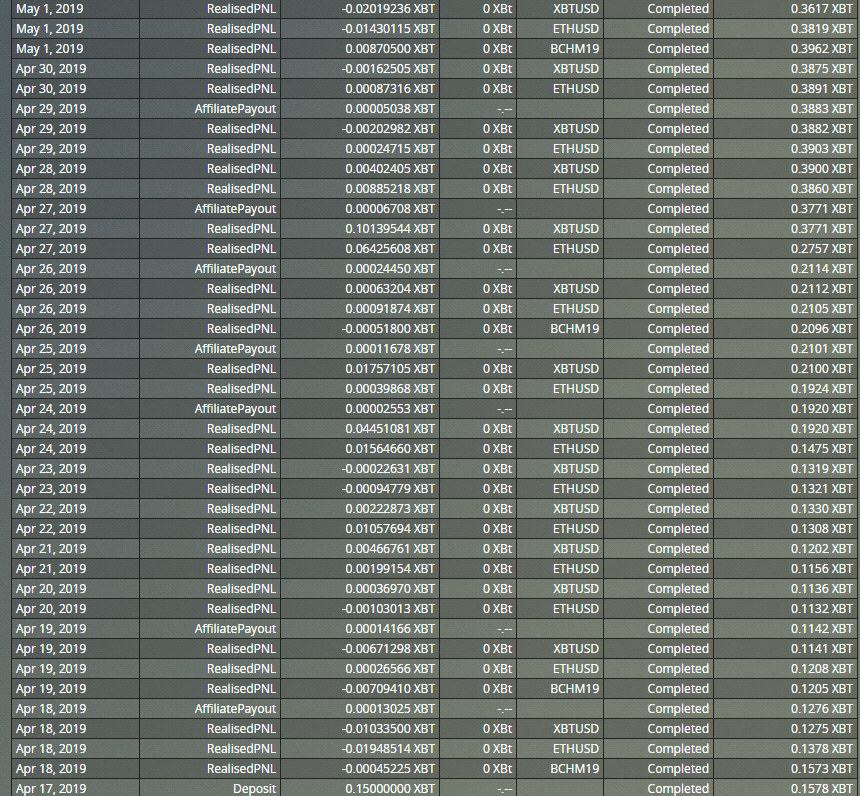 4/5 I will continue to use this small account until the testing is complete. Changes going forward: Increase normal position size for ETHUSD trades. According to my backtests, ETHUSD outperformed XBTUSD trades by a longshot. That information translated well with live funds.