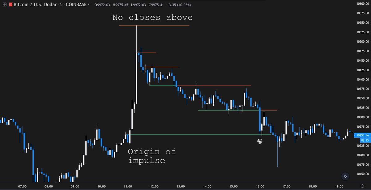 Structure Thread: Slow Bleeds We've been seeing this structure play out quite a lot lately. A sharp impulse move, which has no follow through, and eventually retraces to the origin of the impulse. Features consecutive S/R flips with a series of lower highs and lower lows.pic.twitter.com/O9MpEwFNqh