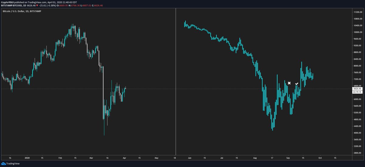 $BTC Interesting fractal Hypothetically, if current price follows the fractal, I could see arguments that we are at 'x' or the '✓' on the chart . What do you think? Bonus points to the person who can find this PA. @HsakaTrades I'm looking at you sirpic.twitter.com/echL3ISfdg