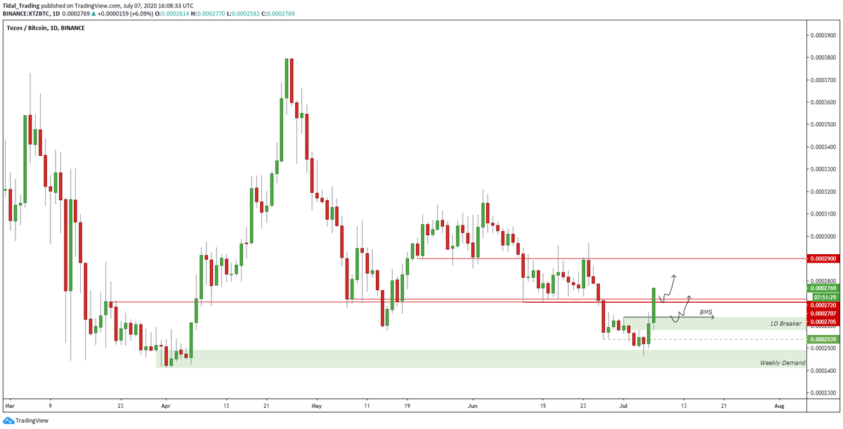 Super bullish on $XTZ -12H Bull div into weekly demand -Broke MS on the 1D to the upside -Flipping HTF support/resistance level -All time highs posted on $LINK, time to catch up Buying the dip at the S/R flip and bullish breaker if we get there. #Tezospic.twitter.com/mmAUymX8hY