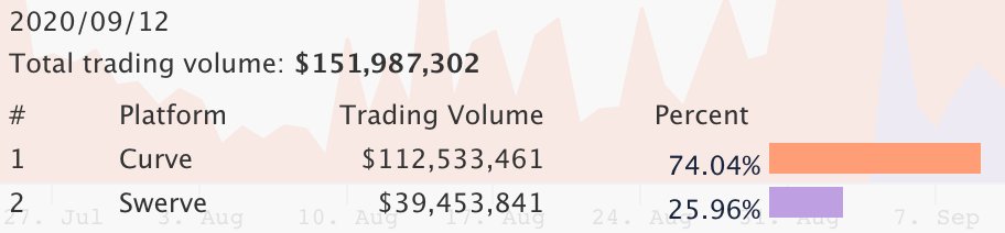 curious if anyone knows the trading volume for Swerve, now that the subsidy is soon to run out? has the issuance schedule paid off or not?https://twitter.com/CurveFinance/status/1304112516453236737 …