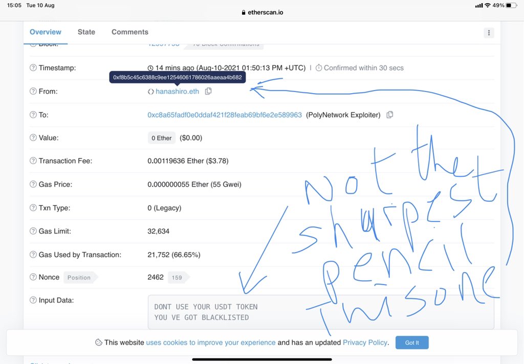 Lol, who is hanashiro.eth and why is he trying to help the hacker. "DONT USE YOUR USDT TOKEN YOU VE GOT BLACKLISTED"pic.twitter.com/oqVlf8quuq