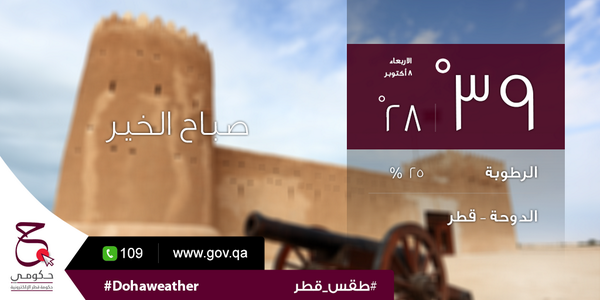 درجة الحرارة اليوم الكبرى ٣٩ و الصغرى ٢٨ و نسبة الرطوبة ٢٥ % #طقس_قطر #قطر #الدوحةpic.twitter.com/IepB9J1eSA