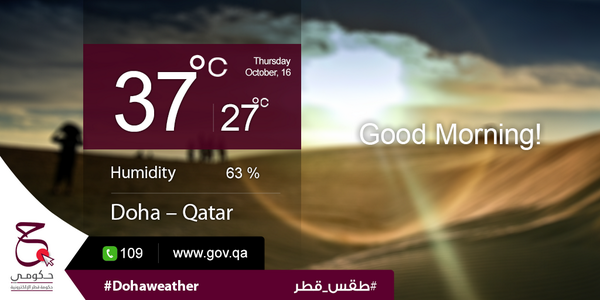 Today's highest temp: 37ºC, lowest temp: 27ºC and humidity: 63%. #Hukoomi #Qatar #DohaWeatherpic.twitter.com/wxXnn5FtMD