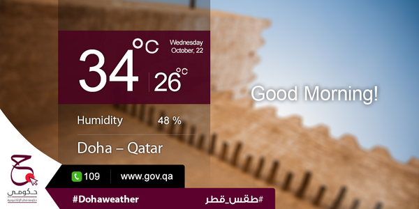 Today's highest temp: 34ºC, lowest temp: 26ºC and humidity: 48%. #Hukoomi #Qatar #DohaWeatherpic.twitter.com/yOKK0UjlC8
