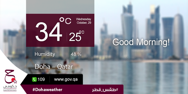 Today's highest temp: 34ºC, lowest temp: 25ºC and humidity: 48%. #Hukoomi #Qatar #DohaWeatherpic.twitter.com/txLXLGqWte