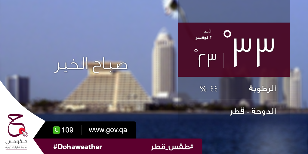 درجة الحرارة اليوم الكبرى ٣٣ و الصغرى ٢٣ و نسبة الرطوبة ٤٤ % #حكومي #طقس_قطر #الدوحةpic.twitter.com/KllNmauBqX