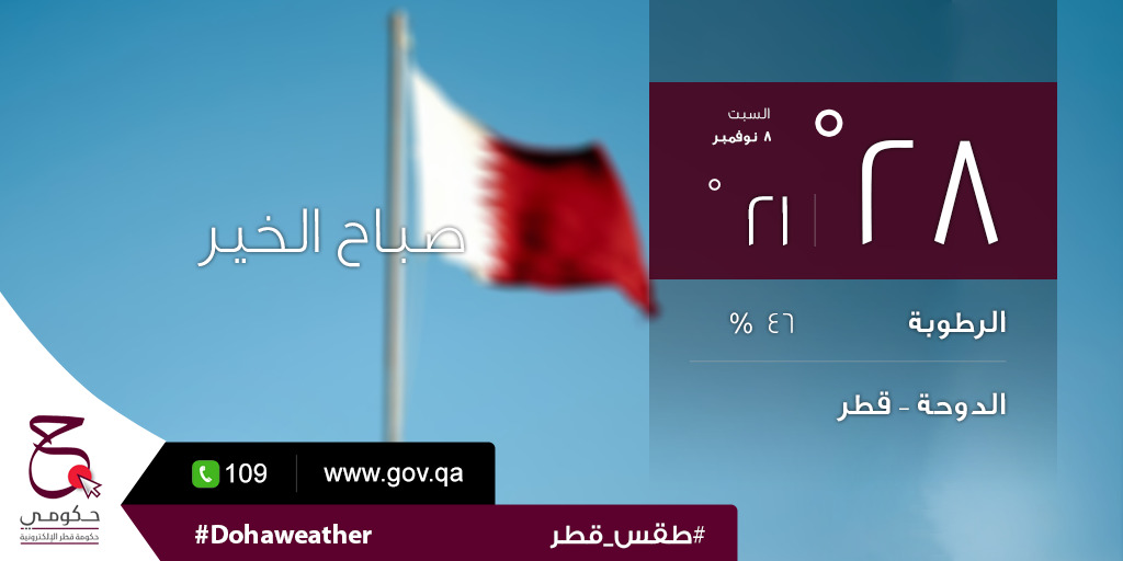 درجة الحرارة اليوم الكبرى ٢٨ و الصغرى ٢١ و نسبة الرطوبة ٤٦ % #حكومي #طقس_قطر #الدوحةpic.twitter.com/xReyBme8dD