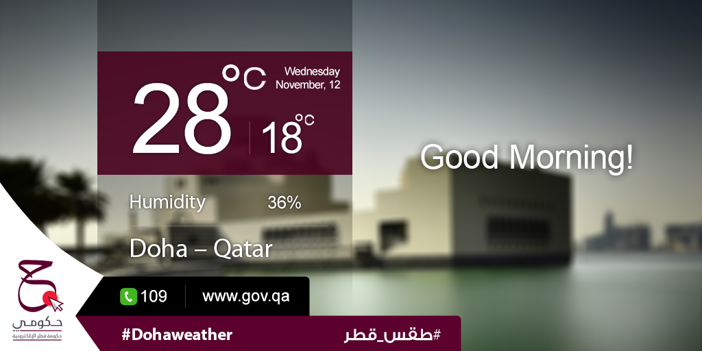 Today's highest temp: 28ºC, lowest temp: 18ºC and humidity: 36%. #Hukoomi #Qatar #DohaWeatherpic.twitter.com/rdJC4HZLtC