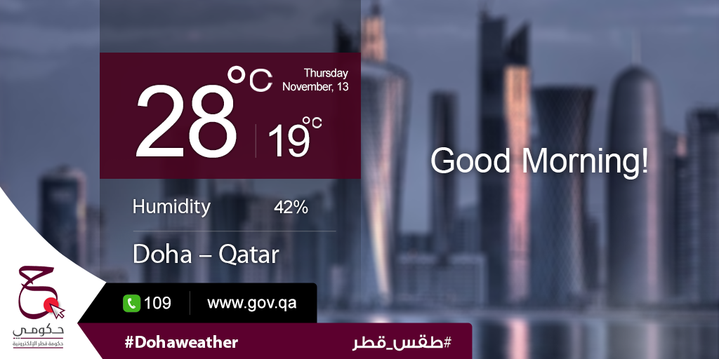 Today's highest temp: 28ºC, lowest temp: 19ºC and humidity: 42%. #Hukoomi #Qatar #DohaWeatherpic.twitter.com/ZAp0f9XkwH
